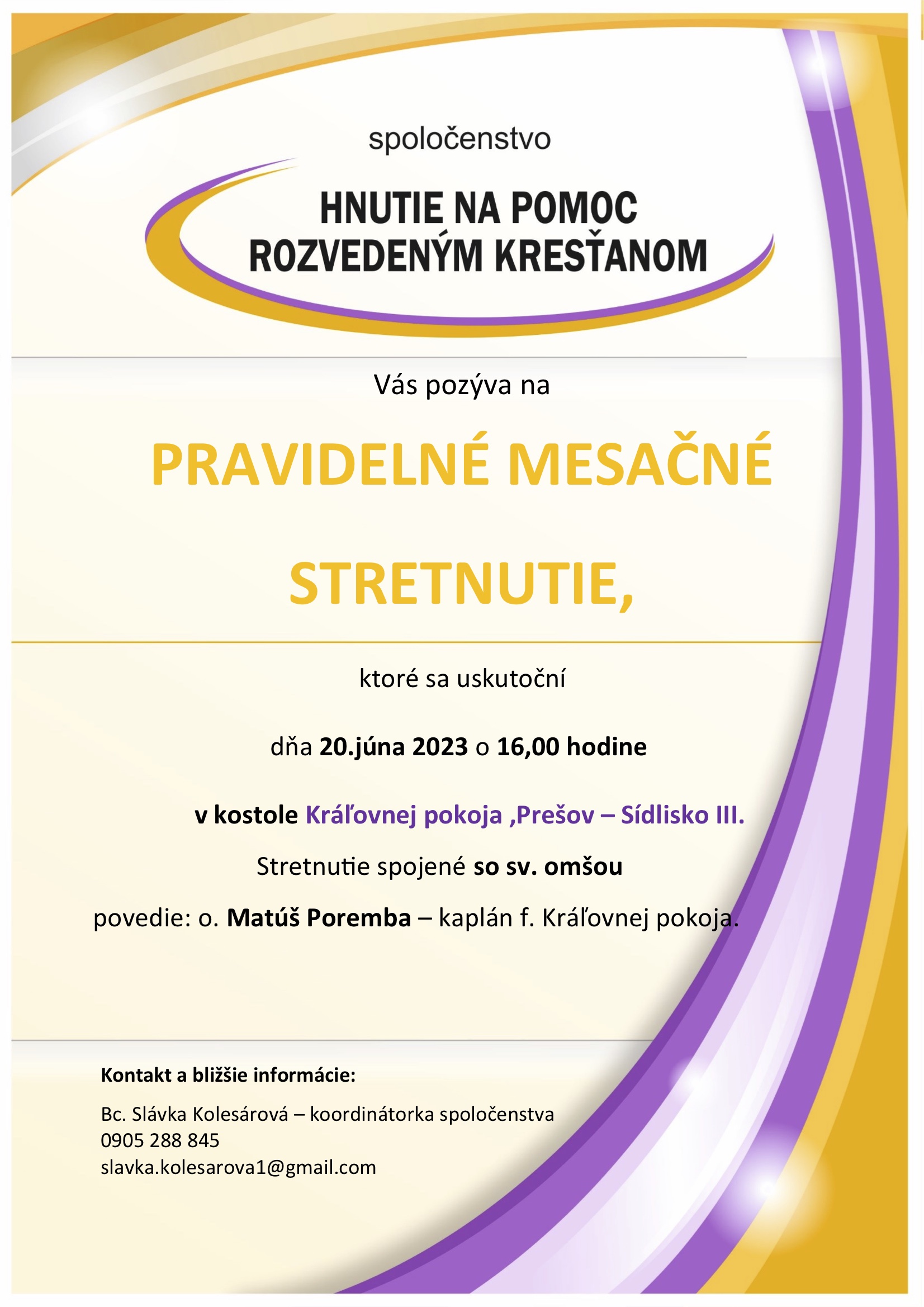 stretnutie  sa uskutoční dňa 20.júna 2023 o 16.00 hodine v kostole Kráľovnej pokoja, Námestie Kráľovnej pokoja 1, Prešov – Sídlisko III.
