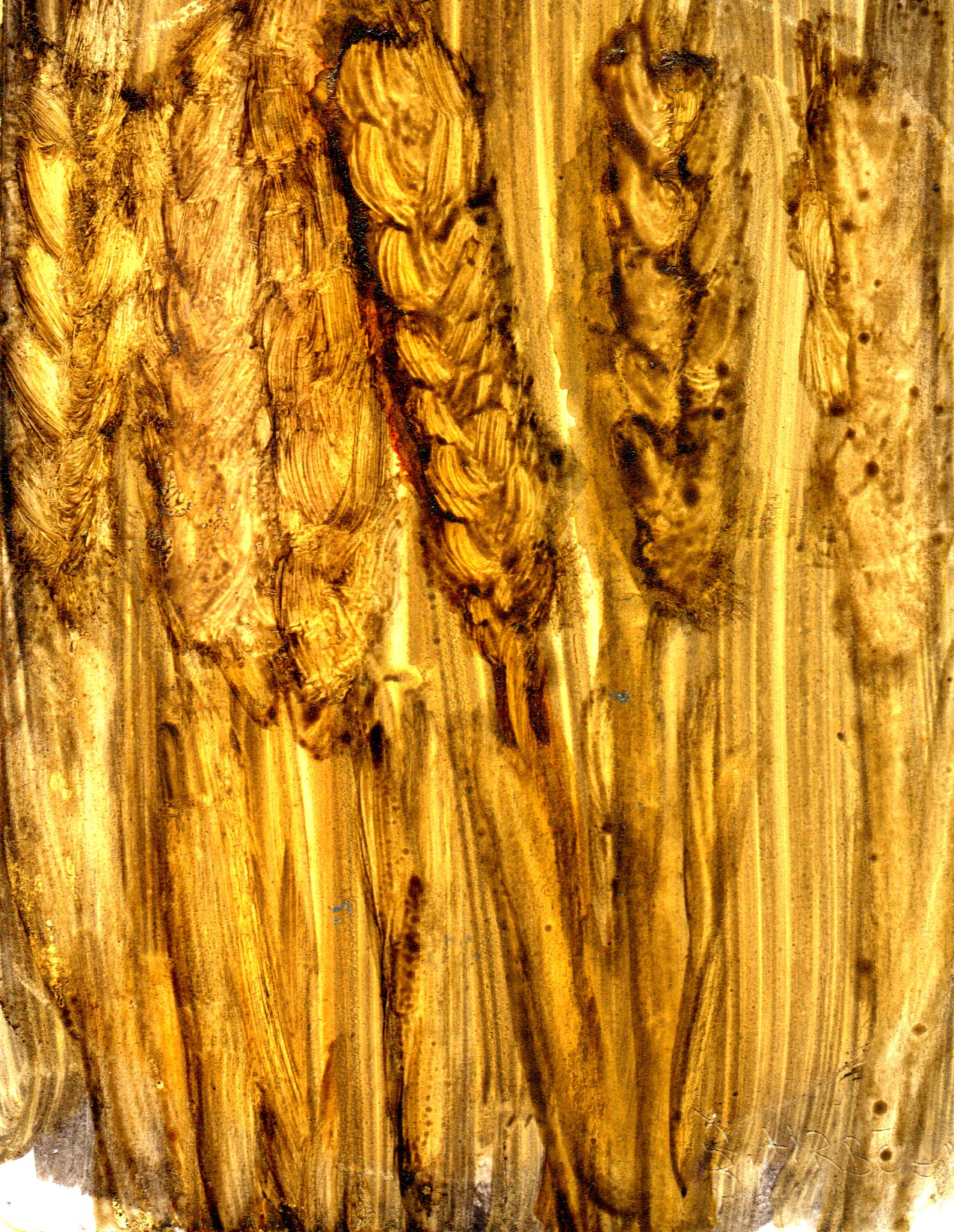 Potom som vodové farby rozrábal a miešal na olivovom mydle a tak som čiernu farbu vyplavil na miestach, kde som chcel mať inú farbu a urobil som ťahy štetcom, aby  sa tam na obrázku ukázalo niečo konkrétne. Do tej "farebnej kašičky"  pridávam ešte malé množstvo metalického akrylu, kvôli tomu lesklému efektu. Potom som ešte niektoré kontúry dotiahol znova čiernou farbou, ak sa mi pigment vyplavil priveľmi.