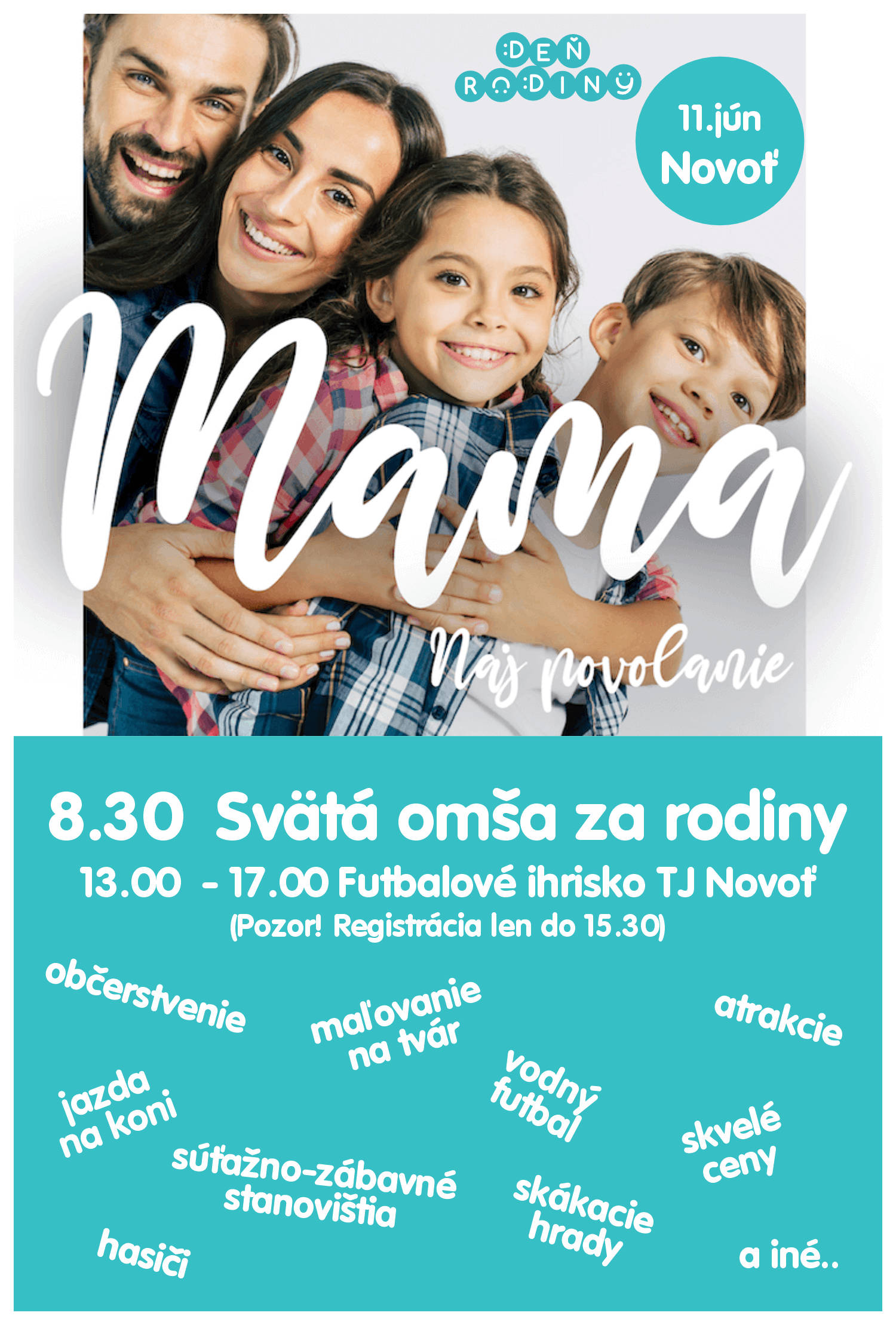Srdečne Vás pozývame osláviť dňa 11. júna Deň rodiny 2023 v našej farnosti. Akcia sa začne sv. omšou za rodiny o 8:30 a pokračovať bude na futbalovom ihrisku TJ Novoť v čase od 13.00 – 17.00. Čaká na Vás pestrý program (viď plagáty) a pohostenie (guľáš a iné dobroty). Šikovné gazdinky môžu ako tradične priniesť chutný koláčik. Tešíme sa na všetkých, malých i veľkých