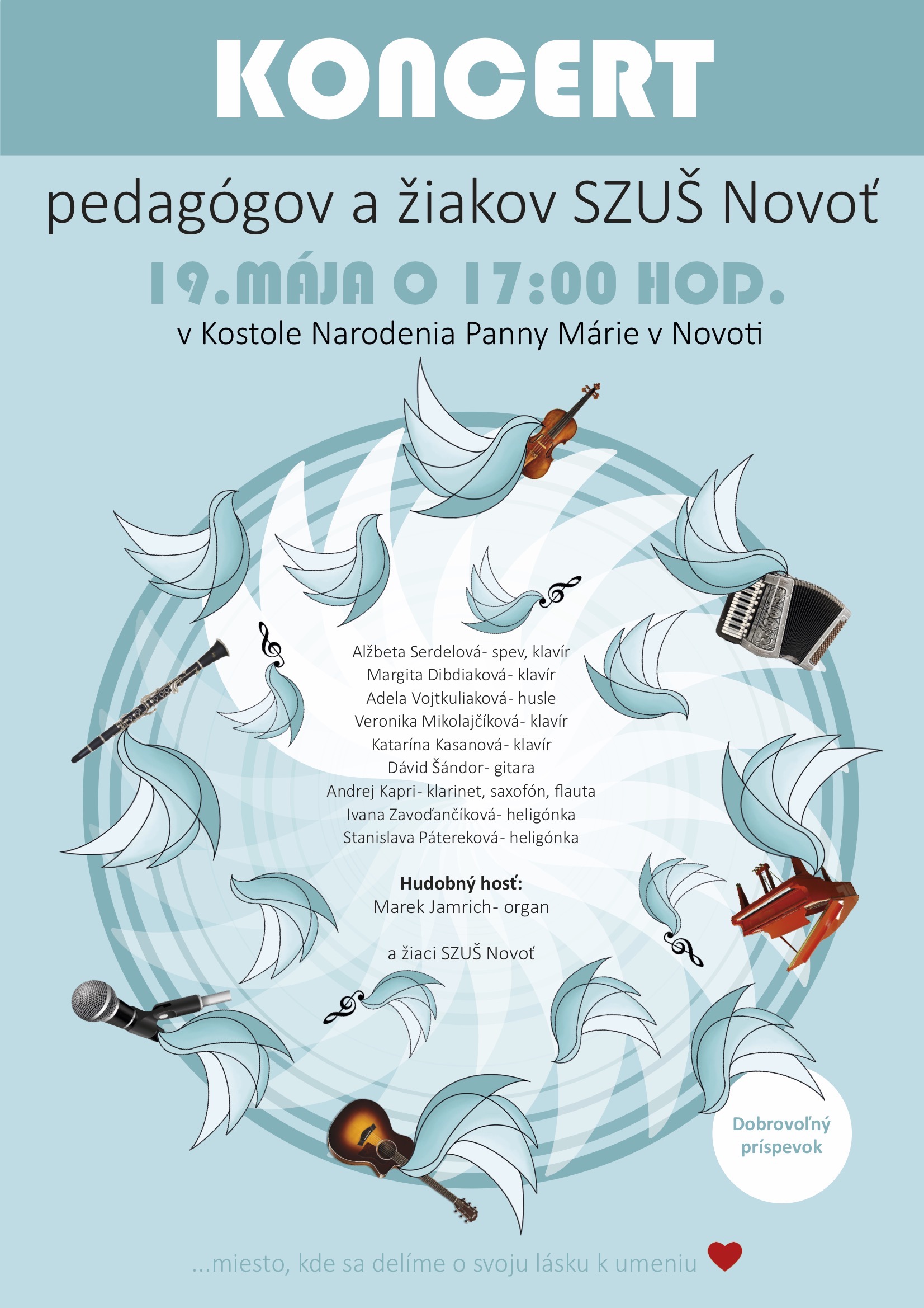 Pedagógovia a žiaci SZUŠ Novoť v spolupráci s farnosťou Novoť Vás srdečne pozývajú na koncert, ktorý sa uskutoční 19. mája 2024 o 17:00 hod. v našom kostole. Zaznejú rôzne hudobné žánre a krásne skladby. Koncert začne organovou improvizáciou na hymnus VENI CREATOR SPIRITUS.