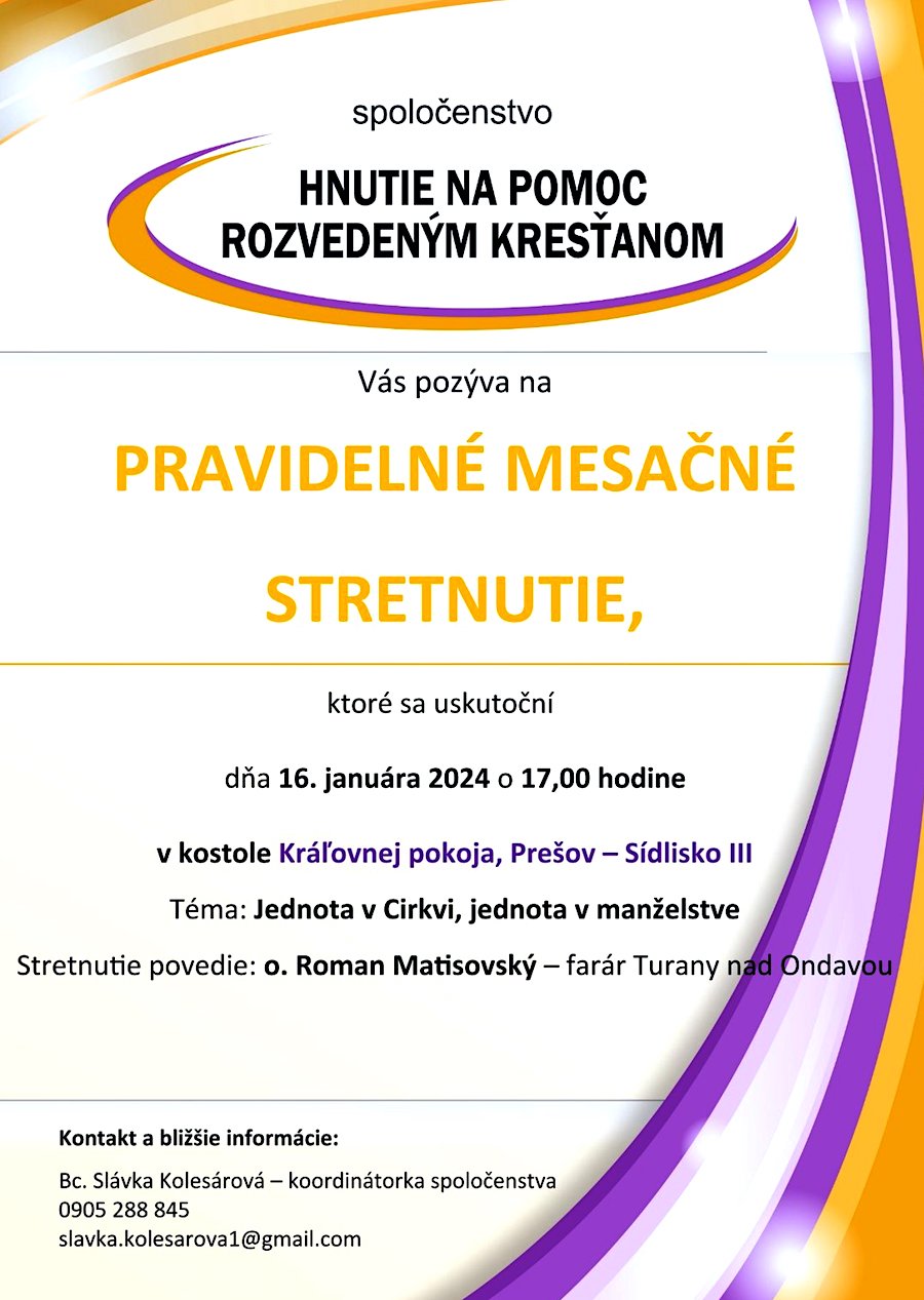 spoločenstvo Hnutie na pomoc rozvedeným kresťanom Vás pozýva na pravidelné mesačné stretnutie , ktoré sa uskutoční dňa 16. januára 2024 o 17.00 hodine