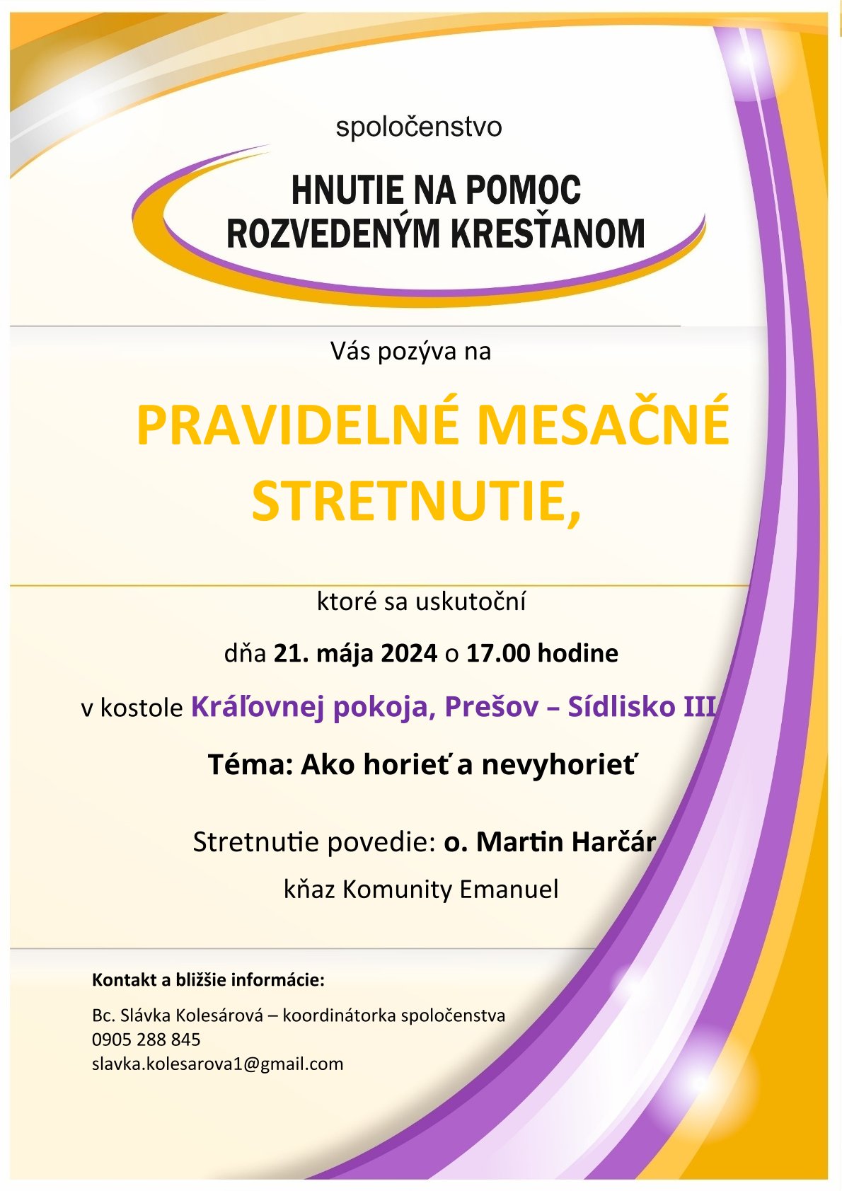 Spoločenstvo Hnutie na pomoc rozvedeným kresťanom Vás pozýva na pravidelné mesačné stretnutie, ktoré sa uskutoční dňa 21.mája 2024  o 17:00 hodine