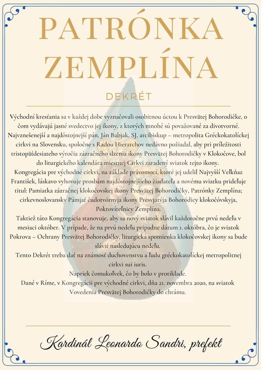 Vo štvrtok 25. marca, v deň sviatku Zvestovania presvätej Bohorodičke, bol v celej Gréckokatolíckej cirkvi na Slovensku vyhlásený nový mariánsky sviatok s titulom Pamiatka zázračnej klokočovskej ikony Presvätej Bohorodičky, Patrónky Zemplína. Zároveň bola klokočovská Bohorodička vyhlásená za Patrónku východoslovenského regiónu, ktorý sa historicky nazýva Zemplín. Nový sviatok sa bude sláviť každoročne prvú nedeľu v mesiaci október. V prípade, že na prvú nedeľu pripadne dátum 1. októbra, čo je sviatok Pokrova – Ochrany Presvätej Bohorodičky, liturgická spomienka klokočovskej ikony sa bude sláviť nasledujúcu nedeľu.